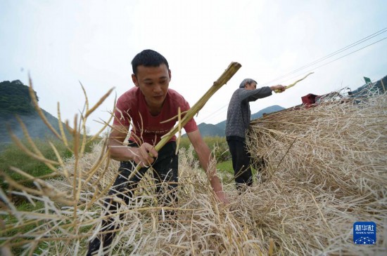 5月6日,村民在贵州省绥阳县枧坝镇黄鱼村采收油菜籽。