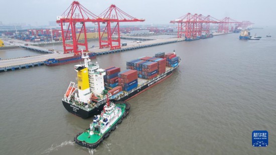 6月12日,一艘外贸航线集装箱船靠泊江苏省太仓港集装箱码头(无人机照片)。