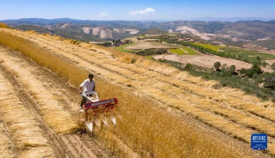 近日,宁夏西海固地区种植的冬小麦陆续进入收割季节。旱塬、梯田上一片金黄,农民操作着收割机械在其中忙碌。据了解,今年固原市夏粮面积42.89万亩,其中冬小麦36.04万亩。