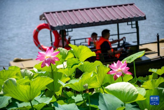 7月6日,载着游客的船从大观公园盛开的荷花旁经过。