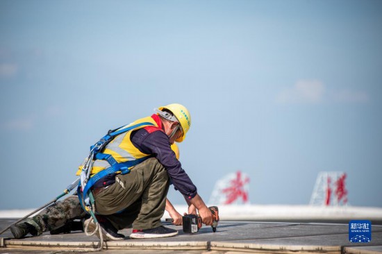 7月12日,工人在武汉天河机场T2航站楼屋面劳动。