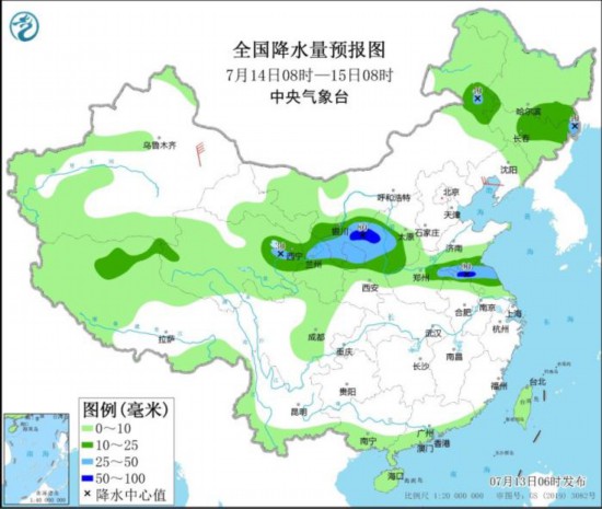 7月14日08时至15日08时,甘肃东部、青海东北部、宁夏中南部、陕西中北部、山西西部、江苏北部等地部分地区有大雨,其中,陕西北部、江苏北部等地部分地区有暴雨(50~90毫米)。新疆东部部分地区有6~7级风。
