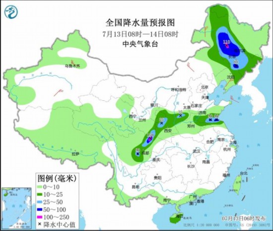 7月13日08时至14日08时,内蒙古东北部、黑龙江西南部、吉林中西部、山东南部、江苏北部、山西南部、陕西西部以及四川盆地西部等地部分地区有大雨或暴雨,局地有大暴雨(100~110毫米)。新疆沿天山地区和南疆盆地、内蒙古东北部、辽东半岛等地部分地区有4~5级风。
