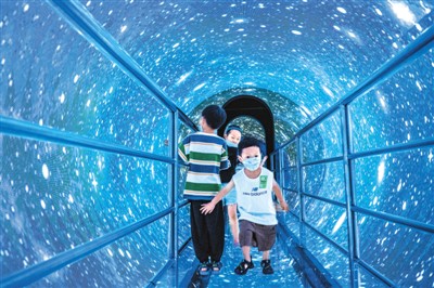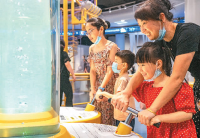 7月16日,浙江省金华市的小朋友们在家长陪同下,走进科技馆,体验各种科技项目。