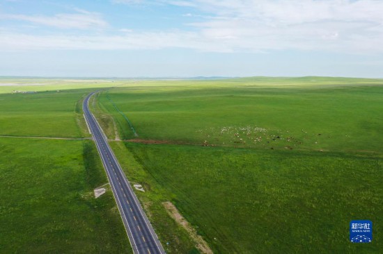 夏日,内蒙古锡林郭勒草原一碧千里,牛羊散落其中,河流蜿蜒曲折,景色宜人。