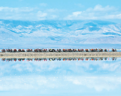 图为参赛选手在第六赛段——茶卡壹号·盐湖景区至都兰的比赛中。