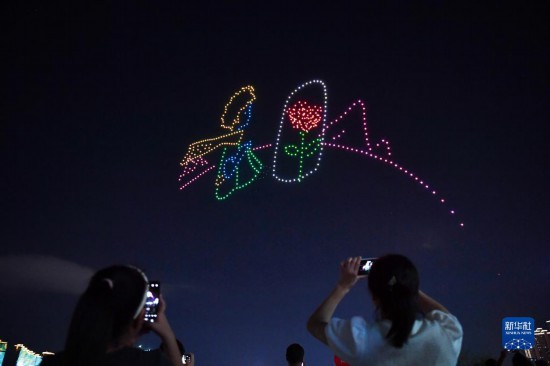 当日是七夕节,一场无人机光影秀在湖南省长沙市湘江畔上演,吸引市民驻足观看。