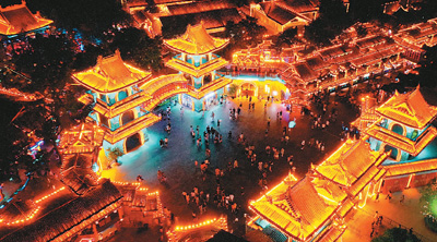 陕西省西安市周至县南依秦岭,北临渭河,当地依托山水相依的自然资源积极打造文旅融合项目。近期,随着西安市持续出台各项措施推动夜间经济、户外经济,周至多个景区及乡村旅游点在做好疫情防控工作的同时,开展形式多样的消暑纳凉活动,刺激消费,推动乡村振兴。图为8月6日拍摄的西安周至水街烟火巷子夜景。