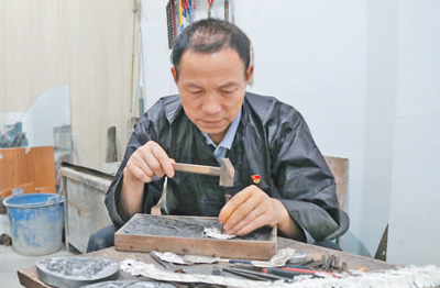 “当当当……”左手用錾子按住银片,右手拿小锤敲击錾子。换了好几种不同型号的錾子后,银片上的图案逐渐清晰起来:戴着帽子的人正策马扬鞭。吴水根(见图,本报记者陈隽逸摄)拿起银片,在灯光下反复检查后,将银片与其他成品放在一起。