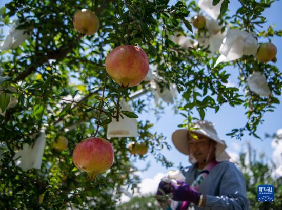 果农在云南蒙自市草坝镇的五八农业软籽石榴种植基地采摘石榴(8月9日摄)。