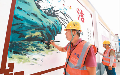 河南省安阳高平村党建书画墙将新时代新理念展示在墙壁上,色彩绚丽、通俗易懂,为村民喜闻乐见。图为日前中建路桥安阳项目部的工人为高平村党建文化广场绘制书画墙。 |