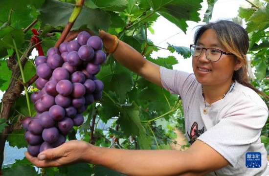 9月6日,在丁家房镇大蛇山子村,果农在大棚里查看葡萄成熟情况。