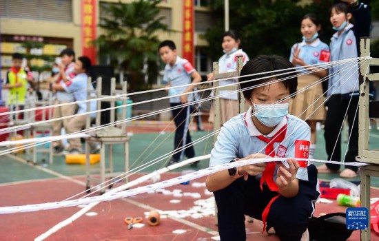 9月17日,学生在河南洛阳市涧西区第二届中小学科创节上参加“牙签建桥”科技项目。