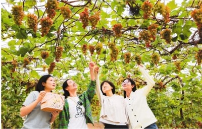 游客在山东省青岛市西海岸新区的一处葡萄园采摘。 |
