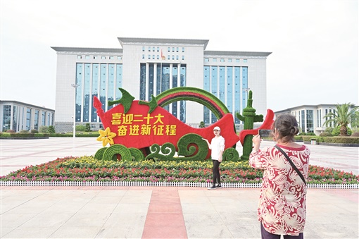 怀化市鹤城区行政中心广场,陈卓琳团队制作的一组主题为“喜迎二十大 奋进新征程”的仿真绿雕,吸引不少市民拍照留影。 湖南日报全媒体记者 雷鸿涛 摄