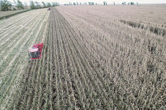 高性能玉米收割机正在田间高效快速收获玉米。