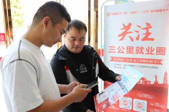 亳州市的社区工作人员正在指导社区居民扫码使用“三公里”就业圈服务平台。(受访者供图)