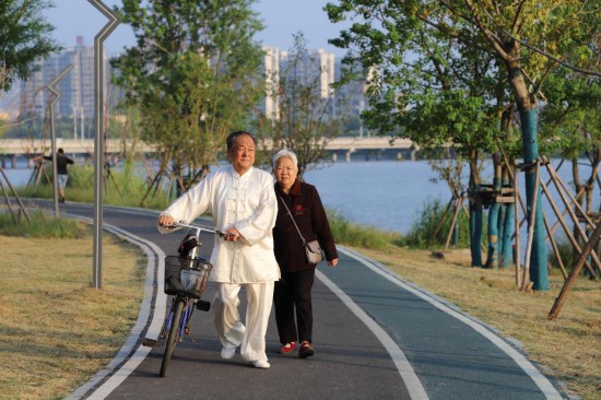 一对老夫妻在公园里锻炼结束准备回家。(受访者供图)