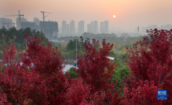 近日,古城西安市雁塔区雁南公园里秋色正浓,吸引游客赏景游玩。