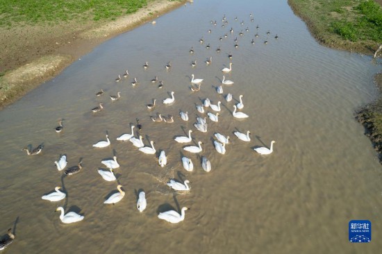 这是11月10日在湖南西洞庭湖湿地拍摄的小天鹅和灰雁(无人机照片)。