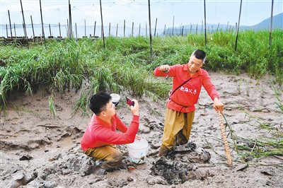 在宁德市霞浦县沙江镇沙江村,返乡创业青年张序剑通过网络直播的方式展现家乡滩涂风光和父亲的赶海生活,逐渐发展为拥有百万粉丝的“网红”。图为张序剑(左)在滩涂上拍摄父亲赶海。 |