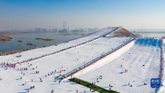 12月31日,市民在宁夏银川市阅海滑雪场体验冰雪项目(无人机照片)。