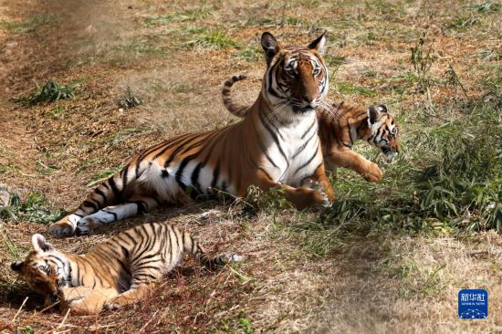 12月31日,在中国华南虎苏州培育基地,双胞胎小华南虎与虎妈妈在一起。