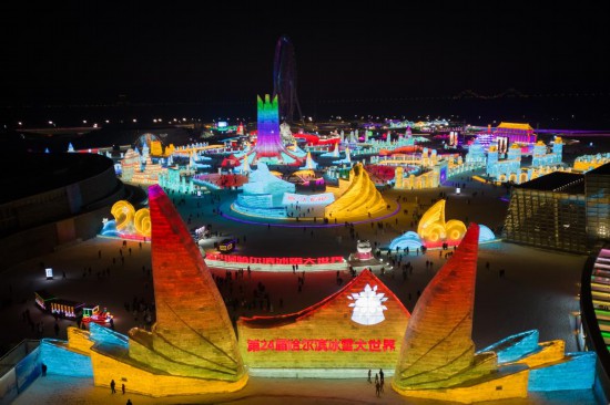 12月31日,游客在哈尔滨冰雪大世界园区游览(无人机照片)。