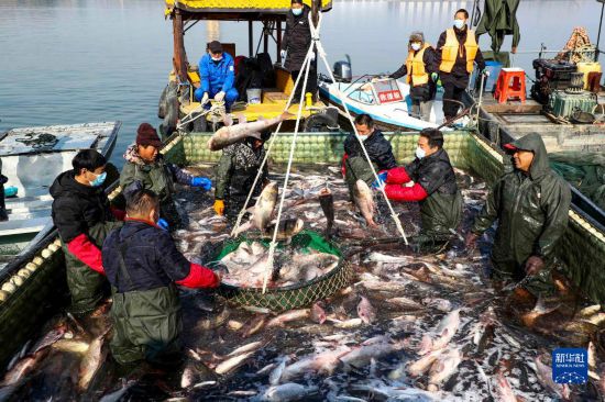 新年临近,江苏省泰州市姜堰区溱湖6000多亩水域进入冬季捕鱼季,渔民们抓紧捕捞供应节日市场。