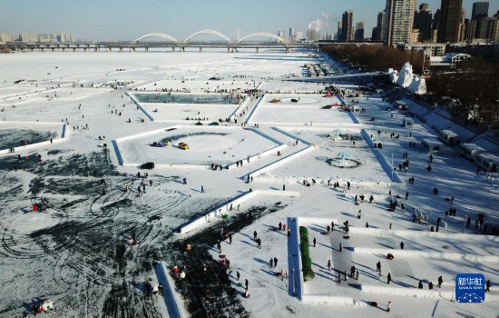 1月1日,游客在黑龙江省哈尔滨松花江冰雪嘉年华园区游玩(无人机照片)。