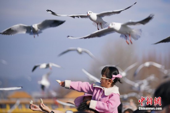 2月2日,昆明冬日暖阳和煦,吸引大批游客来到海埂大坝,与越冬红嘴鸥互动。 中新社记者 刘冉阳 摄