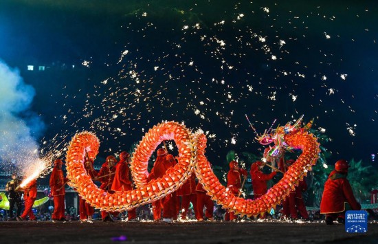 2月4日晚,人们在台江县参加苗族“舞龙嘘花”活动。