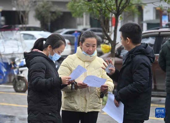 2月9日,在广西融水苗族自治县易地扶贫安置点苗美家园社区,求职者和招聘人员在交流。