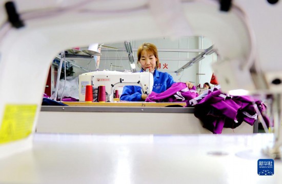 2月13日,在静宁县城关镇南关村一制衣工厂,工人在缝制衣服。