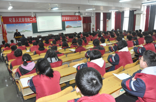 授旗仪式结束后,王瑞勇带领“老兵宣讲团”走进杞县高中开展党的二十大精神首场宣讲活动,宣讲团成员、杞县政协委员、从军营里走出的唢呐大王韩铁宾吹奏了《我是一个兵》,为宣讲暖了场,宣讲团团长、县退役军人事务局副局长李海涛以《深入学习宣贯党的二十大精神 勇做杞县红色革命文化传承人》为题作了宣讲,内容层次清晰、内涵丰富,既有“接地气”的理论阐述,也有“冒热气”的具体事例,赢得了在场师生的情感共鸣和精神共振,现场不时响起阵阵掌声。同学们纷纷表示:“今天的报告让我深刻领悟到党的宏伟蓝图,激发了内心的动力,不忘初心牢记使命,以坚强的体魄优异的成绩,争取考入理想大学毕业后参军入伍,报效国家,回报社会,回报家乡!”(张称心刘银忠)