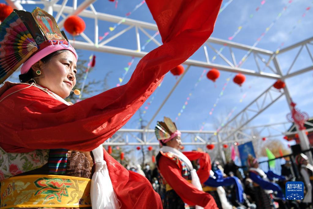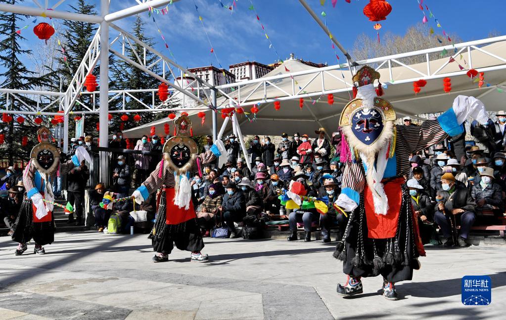 2月25日,演员在拉萨市宗角禄康文化广场表演藏戏《卓娃桑姆》。