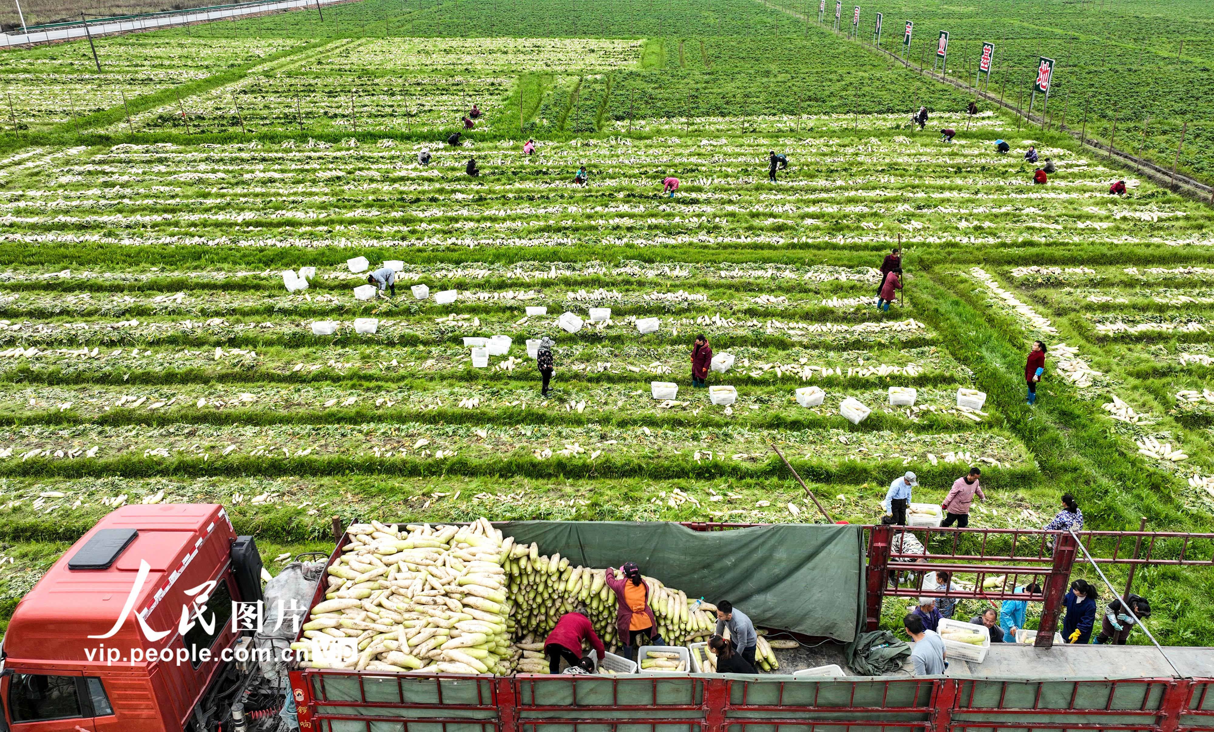 2023年2月25日,江西省萍乡市莲花县升坊镇石江村萝卜种植基地里,农户们在忙着给新出土的萝卜去泥、分拣、装运。李桂东摄(人民图片网)