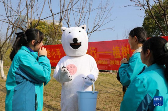 3月5日,穿着卡通服装的志愿者给参加义务植树活动的学生们讲解植树知识。