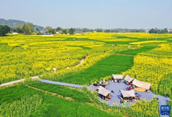 近日,位于四川成都崇州市的数万亩油菜花竞相绽放,吸引游客前来踏春观光。