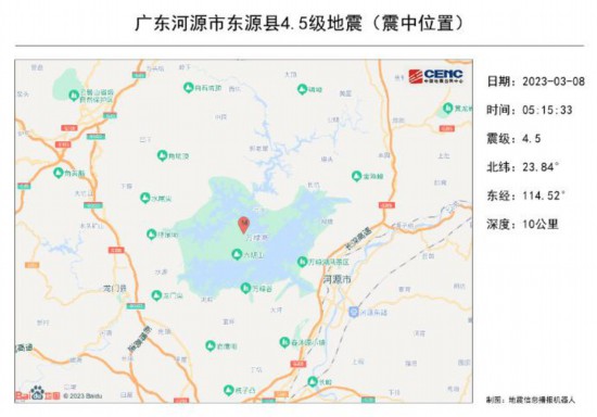 中新网3月8日电 据国家地震台网官方微博消息,3月8日5时15分在广东河源市东源县(北纬23.84度,东经114.52度)发生4.5级地震,震源深度10千米。此次震中位于新丰江水库,距河源市区21公里,距广州市150公里。