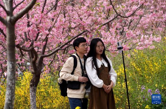 3月10日,市民在荥阳市古柏渡丰乐樱花园内拍摄视频。