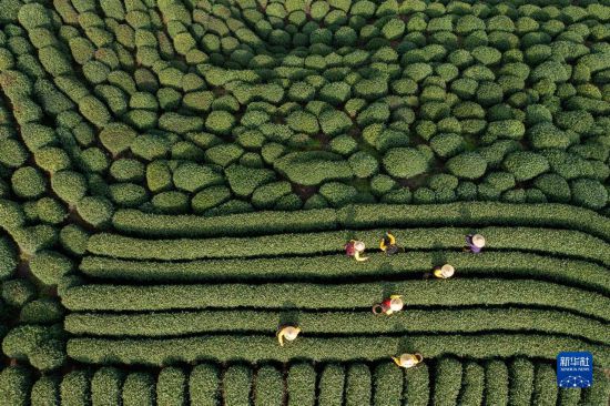 3月13日,龙井村的茶农在采摘西湖龙井“明前茶”(无人机照片)。
