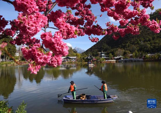 3月22日,在云南省丽江市古城区黑龙潭公园,环卫工人在打捞水面垃圾。