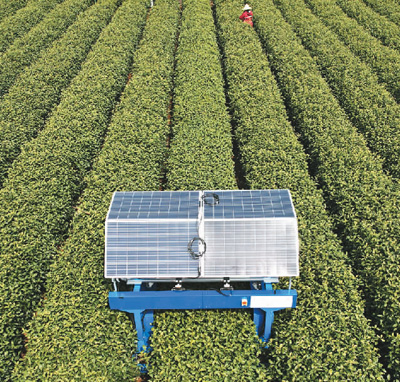 近日,一台AI采茶机器人在浙江杭州西湖区西湖龙井原产地一级保护区的茶园里投入使用。据了解,AI采茶机器人通过图像识别和人工智能算法能对茶叶嫩芽精准识别,从而确保能采摘西湖龙井明前茶的嫩芽。同时,AI采茶机器人还运用了光伏发电技术,可实现24小时不间断绿色环保采茶。图为AI采茶机器人在该茶园里采摘西湖龙井明前茶的嫩芽。