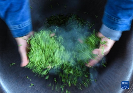 4月4日,在四川省汶川县水磨镇牛塘沟村,当地茶农在将茶叶炒青。