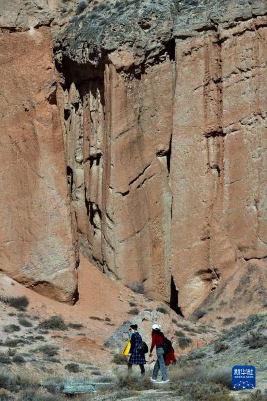 4月8日,游客行走在青海贵德国家地质公园丹霞地貌间。