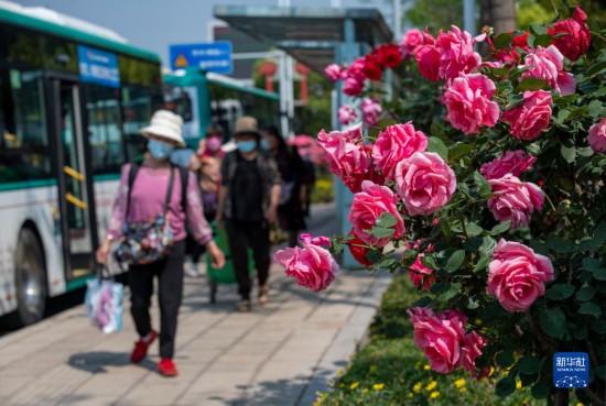 这是4月9日拍摄的昆明市广福路一处公交站台旁的月季花。