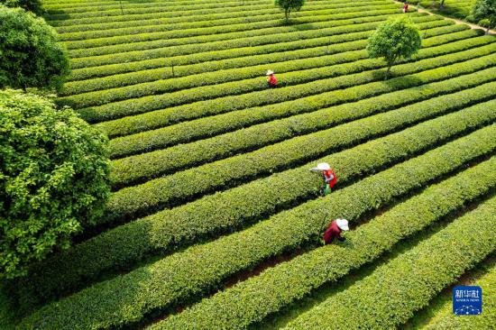 4月11日,在长沙望城乌山贡茶基地,茶农在采摘春茶(无人机照片)。
