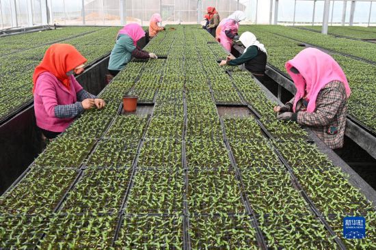 在张掖市甘州区党寨镇陈寨村玻璃智能温室内,农民们进行间苗作业(4月10日摄)。