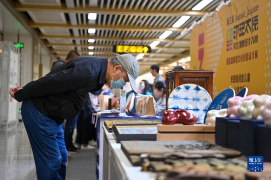 5月9日,在太原地铁2号线大南门站,市民参观第三届“印记太原”文化创意设计展。